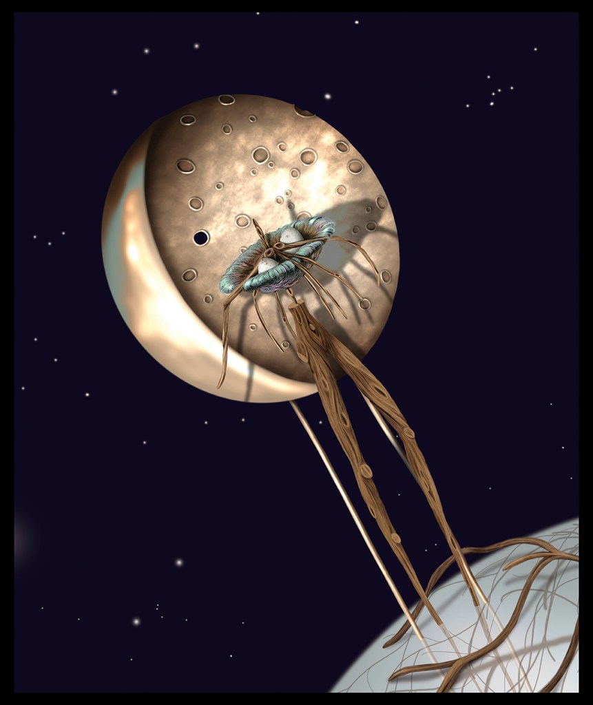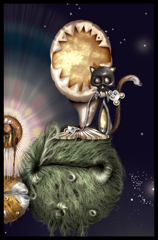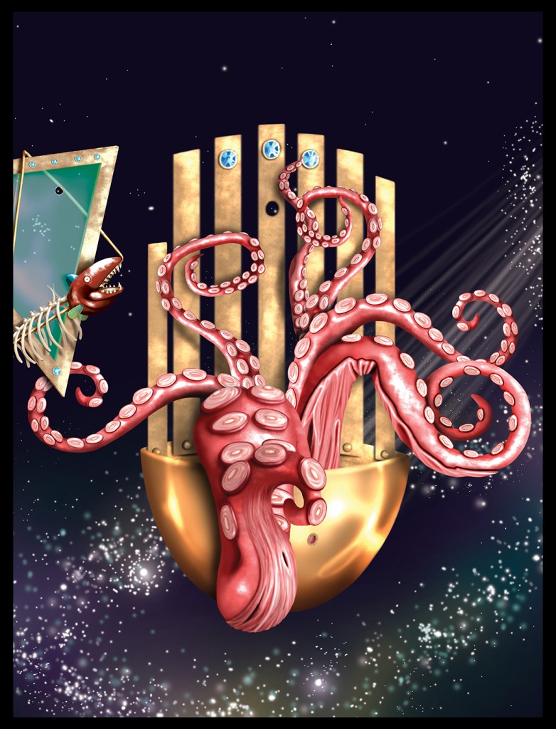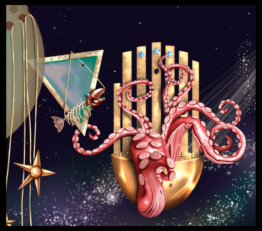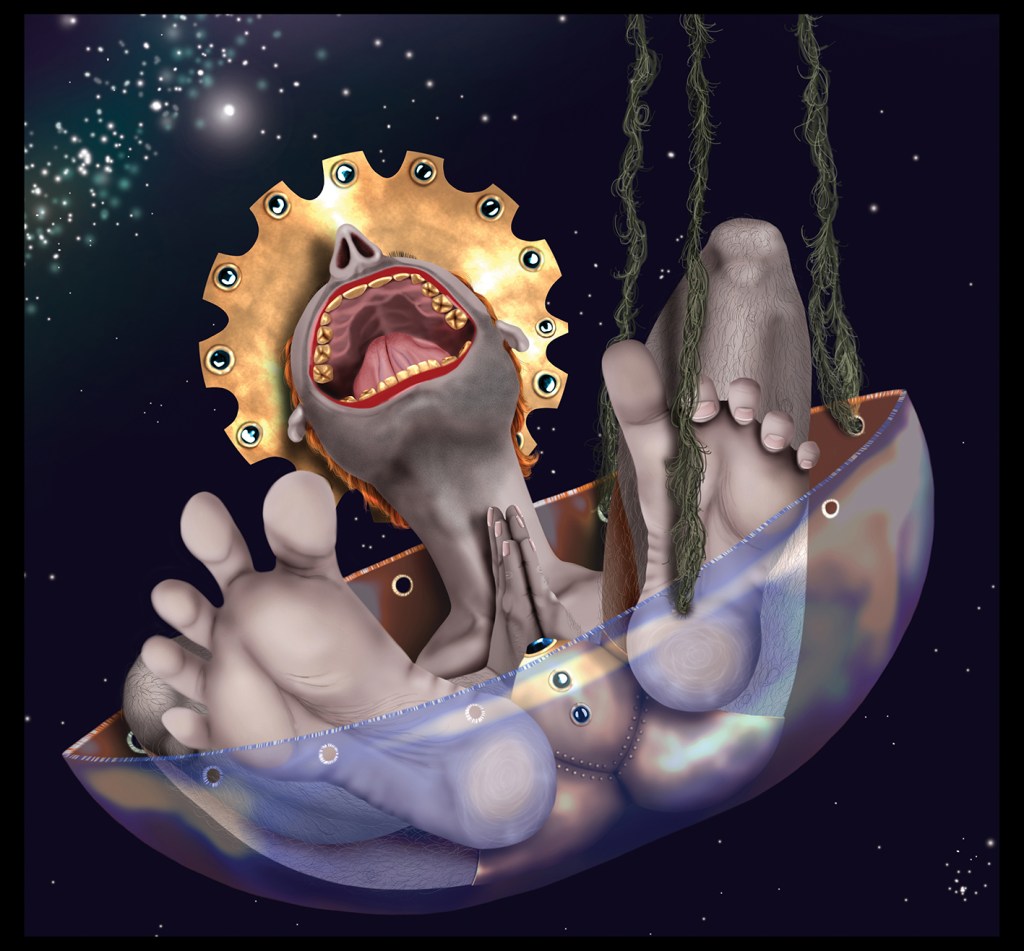 The painting is composed of 13 main characters that include a golden background and a space environment.