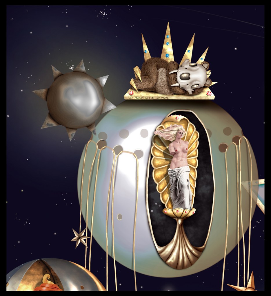Below Pinocchio and the Royal Family are the female archetypes of perfection: The Windged Victory of Samothrace, the Woman of Willendorf (fertility) and the Venus de Milo (beauty and harmony).