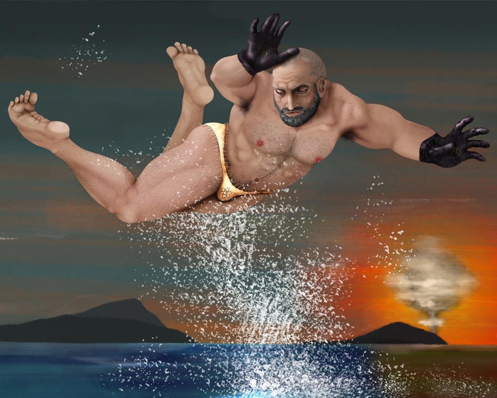Beside these, the artist adds a personal mythology, his own Olympus including the Nuclear God, with the atom symbol in gloves and slip; the Magnetism God, throwing his rays in the sky; and the Gravity God, blue and six arms like the Hindu God Shiva, but with the planets in his hands and an apple, Newton’s apple or perhaps Eve’s.