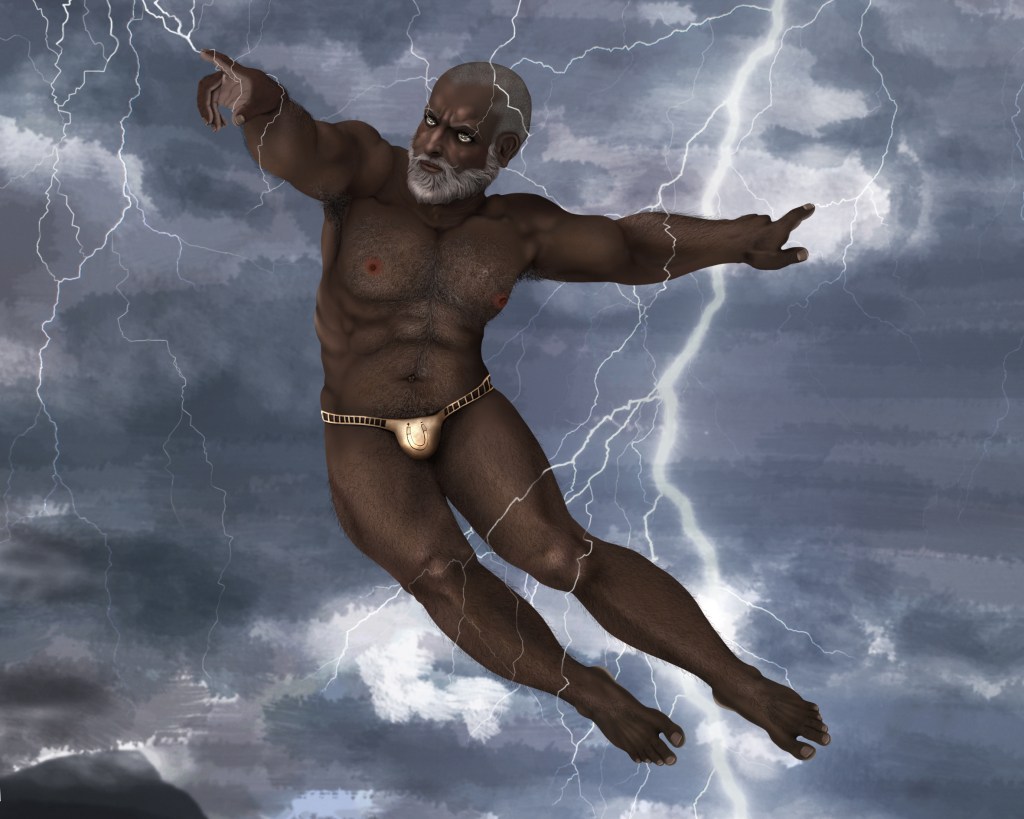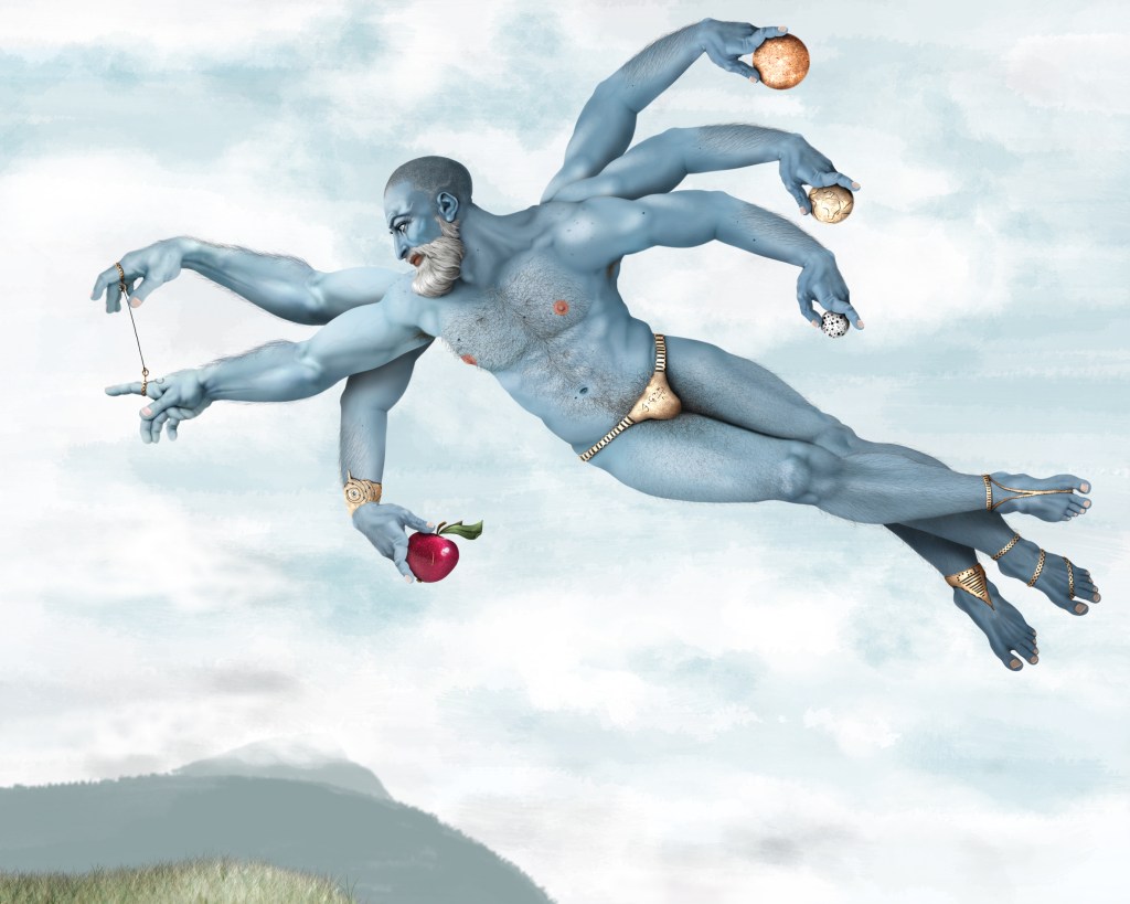 - God separating light from darkness becomes the God of gravitational force, holding a Newtonian apple as homage to scientific discovery.