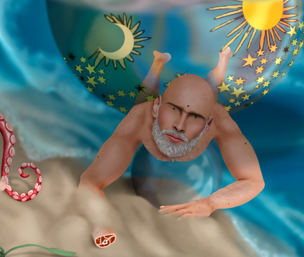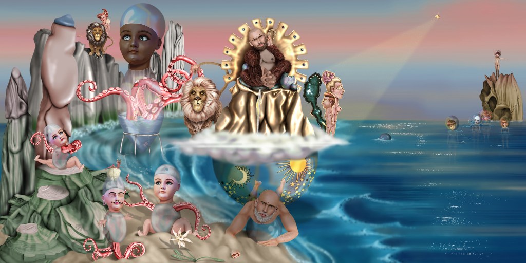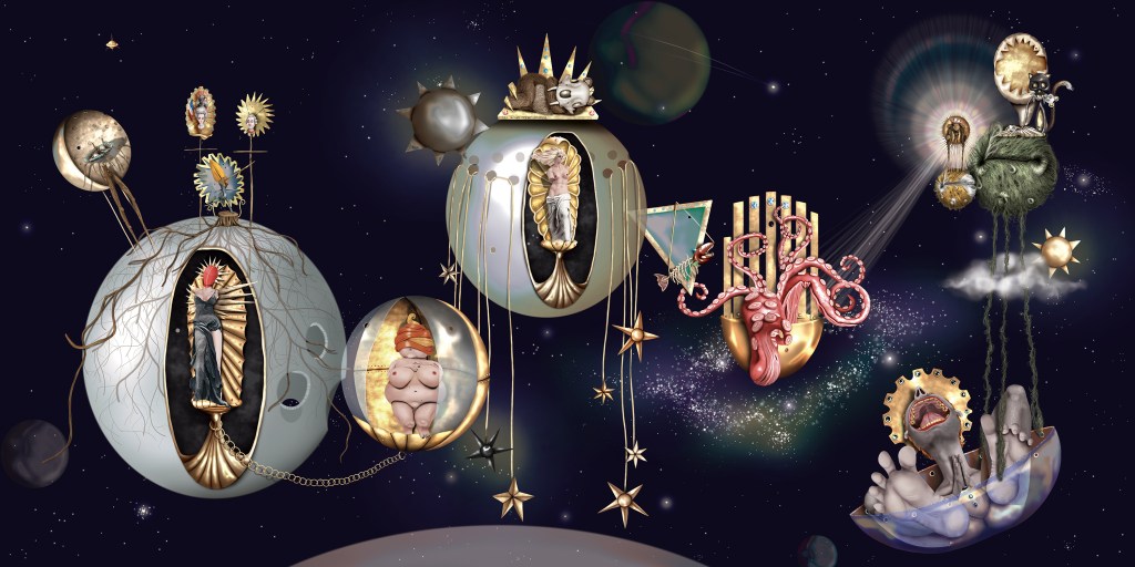Visuals: (immagini dei lavori SZ Cosmogony: gorilla, drag queen, figure mitologiche, tentacoli, uova, simboli alchemici)