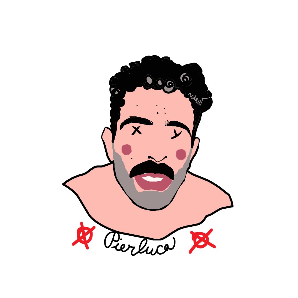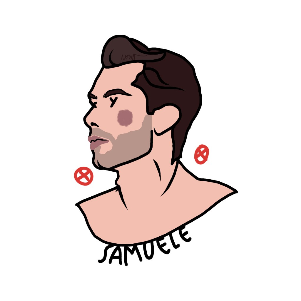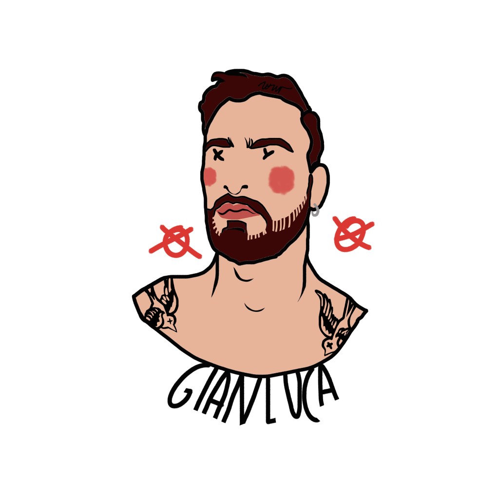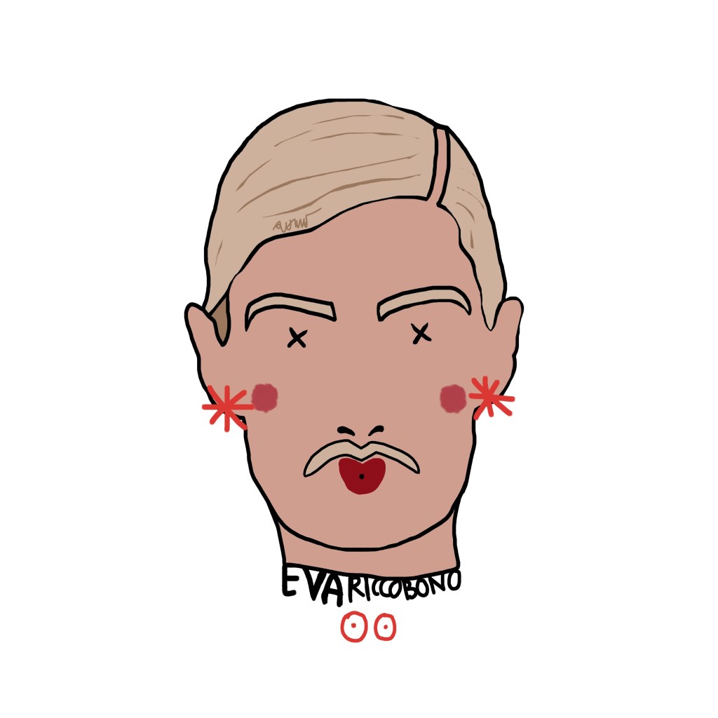 Among these marks, one element is crucial: the name beneath the portrait, the only trace of identity that survives, a cultural imprint that defines us even when the face disappears. Sex chromosomes replace the eyes—XX for female subjects, XY for male—while two stylized red nipples at the sides of the face—circles with a dot (XX) or a cross (XY)—evoke identity, exposure, desire, and vulnerability.